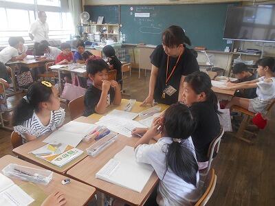 3年1組は算数、あまりのある割り算の学習です。「35人全員が4人ずつ長椅子に座るのに必要な椅子の数」をグループのみんなで話し合い正解を求めます。みんなで話し合いながら求め方をしっかりとまとめることができました。友達への意見の伝え方、話の聞き方、とても上手です。