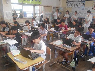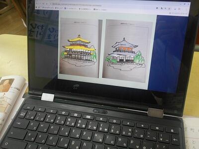 6年1組は社会、「室町時代の文化の特色」についての学習です。タブレットを使って金閣、銀閣を塗り分けたり、調べたことを図にまとめたりしました。さすが6年生、タイピングのスピードの速いこと、速いこと、ブラインドでスイスイと打ち込む姿に見とれました。