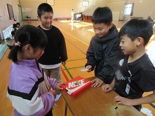 ちり箱にセッティングすればそのまま捨てることができるダストボックス、リサイクルバック、そしてかわいらしいサンタさん。4年生も6年生も大事そうに抱えて持ち帰りました。