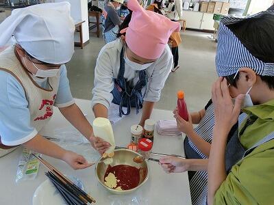 次に家庭科室に場所を移し、それぞれのグループで考えたオリジナルレシピによるメンマの味付け体験を行いました。「大人から子どもまで食べられるさっぱりメンマ」「おつまみつまみメンマ」など面白いネーミングがいっぱいです。自分たちで決めた様々な調味料を使って味付けしていきました。試食してくださった江原さんや校長先生、保護者のみなさんもいろんな味を大いに楽しみました。もしかしたら、将来、道の駅などに並ぶ・・・かも?