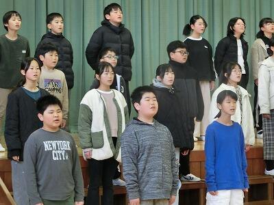 6年生代表児童のリードによる、「三本の気」の全校朗読の次に、2年生代表児童が2学期を振り返って作文を発表しました。漢字と九九の練習をがんばったことを発表してくれました。漢字の練習ではお家の人とプリントを作って練習したり、九九は歌に合わせて練習したりしたそうです。覚えるための方法を考えて工夫し、あきらめずにしっかりと取り組めたのはとても素晴らしいですね。これからも楽しみながら学習を進められそうです。