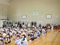 まず初めに、「小さな世界」を3年生のみんなで合唱しました。体育館いっぱいに美しい歌声が広がります。次に、「よう気なかじ屋」を歌に手合わせを加えてで楽しく発表しました。その後、代表のお友達が手合わせの仕方をみんなに教えて、全校のみんなで手合わせ歌を楽しむことができました。朝から、歌を歌って、手合わせをしてみんな元気になりました。