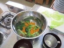 今回のゆで野菜の材料は、にんじん、ブロッコリー、キャベツの3種類です。さすがは、栄養教諭の指導だけあって彩りも考えられています。しかも、にんじん→ブロッコリー→キャベツという順番でゆでていきます。これは、火の通りにくい順にゆでているということです。ブロッコリーやキャベツは、火を通しすぎないように、土井栄養教諭からの指導がありました。