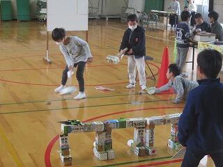 2年生が保護者の方にも手伝っていただいて作っていたおもちゃを使って、今日の2校時体育館で1年生とおもちゃまつりを行いました。