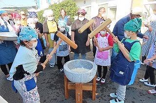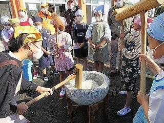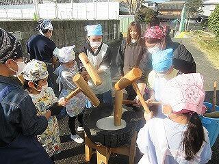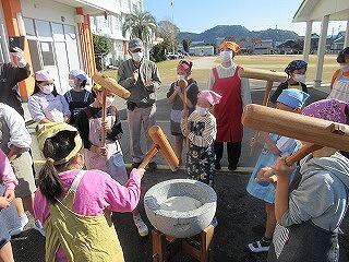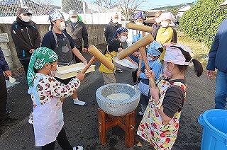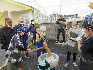 もちつきは、まず5年生が行いました。地域の方々のアドバイスを素直に聞き頑張ろうとしました。しかし、杵に振り回されてまるでダンスを踊っているような子がいたり、へっぴり腰で、ぎっくり腰をやるかもと心配になったりする子がいたり・・・。おいしいおもちになるには、こんなにも楽しい過程を踏めるなんて幸せな時間になること間違いなしです!!