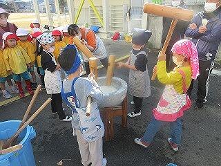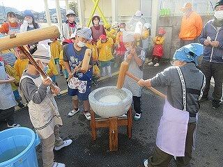 1・2年生とカナリヤ幼稚園の子どもたち。3・4年生。5・6年生と45キロの餅米を3時間かけてついていきました。