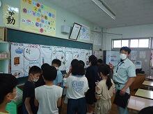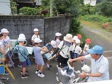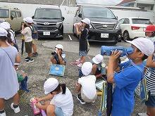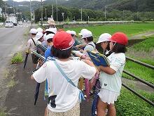 2年生の生活科で最も大切で楽しみな学習が、「町探検」です。7月20日(木)の1校時から2校時まで町探検に出かけました。メモのための探検バックを持って行くのはもちろん、曇りの天気とはいえ、朝から暑い日でしたので、水筒も忘れずに持って行きました。