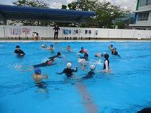 着衣泳では、水の中を歩いたり泳いだりして動きにくさを体感しました。そして、おぼれたときの対処法として体の力をぬいて浮かぶ、ペットボトルなどの身近にある「浮かぶもの」につかまって浮かぶことなどを学びました。また、救助のために、おぼれている友達にペットボトルを投げる練習をしました。