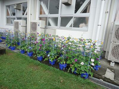 どうです、このすてきなアサガオ。1年生が春先に種を植えて、水やりを欠かさずして、立派に育てました。このアサガオをよく見ると、赤紫に青紫、やや薄い赤紫にほとんど白に近い青紫など、実に様々な色があることに気がつきます。しかも、どれも大変美しいので、思わず見とれてしまいます。