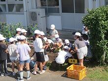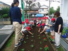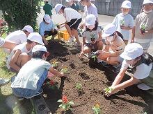 もっと、花をいっぱいにしたくて、全学年のみんなで学級園の花の植え替えをしました。学校技術員の中城先生に、「サルビア」「マリーゴールド」「ニチニチソウ」の苗を準備していただきました。また、植え替えの仕方も中城先生にていねいに教えていただきましたので、上手に植え替えができました。