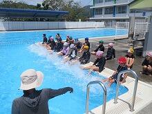 5・6年生は、「着衣泳」を実施しました。体育服を着たままシューズを履いたままプールに入るのは、初めての経験です。5・6年生のみんなは、服を着たまま水の中に入るとどんな感じがするのかを確かめていきます。そして何より大切なのは、日常で服を着たまま泳ぐことも起こりうる、そのような状況でも自分の命を自分で守ることができる方法を知ることです。他の県では、夏休みがすでに始まっており、痛ましい水の事故も発生しています。本当に悲しいことです。