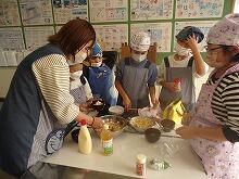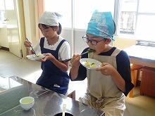 上学年のお友達には、どんなものが入っているか(食材の種類、アレルギーへの配慮、調味料など)を意識したり、非常食の特徴(賞味期限の長さ、柔らかな食感、食器がなくても食べられるようにしているなど)を考えたりしながら食べるように声かけをしました。