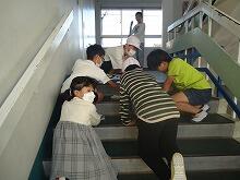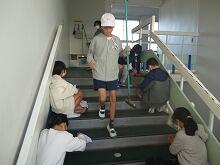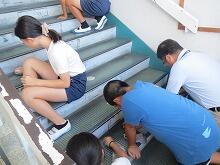 「川島小学校をきれいにするための取組」第3弾(11月)は、4年生の東階段掃除です。いつも元気な4年生25名が、朝活動の時間にワイワイ、ゴシゴシにぎやかに東階段清掃に取り組んでいます。今回も、運営委員会の皆さんも一緒になって掃除をしていました。
