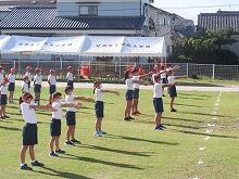 希望したお友達は楽長の遠矢さんの指導による指揮体験ができました。希望したのは、4年の福富紗良さんです。緊張しながらも立派に指揮をして音楽隊の皆さんの演奏をコントロールしていました。いつの間に練習をしていたのか、「川島小学校校歌」「港小学校校歌」もサプライズで演奏していただきました。音楽隊の皆さんが演奏すると、聞き慣れた校歌もおしゃれに聞こえるから不思議です。