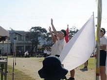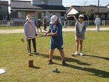 5年生はほとんどのお友達が、グラウンドゴルフ初体験でしたので、地域の方からいろいろと教えていただきながら挑戦していました。旗をめがけたつもりで、クラブでボールを打ちますが、これがなかなかうまいこといかないのです。運動場の凸凹で、微妙にボールが曲がってしまうのです。