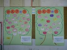 11月2日(木)の全校朝会で10月の生活目標「自分の体を大切にしよう」のふり返りを行いました。養護教諭の戸髙先生のアイデアで「元気の木」に自分で考えた「目標の実」を貼って、1ヶ月間その目標を意識して生活するようにしました。