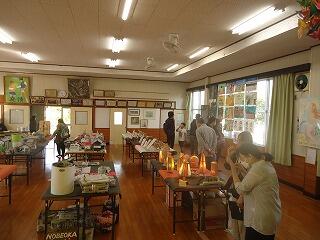 営農集荷所のホールに、能面や板金のミニチュア、陶芸や竹細工、流木の作品、絵画や書などたくさん並んでいます。近くに製作された方がいらっしゃって、作品についての説明もしていただけます。また、木村さんによる板金作品の絵付け体験や甲斐さんによる新聞紙エコバッグ製作教室もあり、子どもたちも楽しく参加できました。