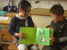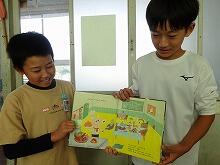 さて、「くいしんぼうのおしょうさん」の紙芝居には、お話の途中の挿絵に「①」「②」・・・が入っています。「あれ?上村さんと橋口さんは、挿絵をまちがえたのかな?」と思ったら、これがクイズになっていました。題して、「このお話の挿絵はどれ?」クイズです。お話をよく聞いていないと当てられませんが、1年生も3年生も正解しているお友達が何人かいるではないですか。しっかり聞いていますね。
