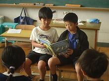 本をつかったクイズやゲームをとおして、本に親しませることを「アニマシオン」と言うそうです。6月22日(木)に、図書館支援業務がありました。延岡市立図書館司書の上村さんと橋口さんが来校されて、1年生と3年生のお友達とアニマシオンを楽しみました。