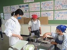 ゆであがった野菜は、ボールの中の水に浸して素早く冷やします。こうすると、野菜の色も鮮やかなまま、歯ごたえも残るということでした。5年生のみんなは、野菜をゆでたり、包丁で野菜を切ったりすることが非常に手慣れた様子でした。