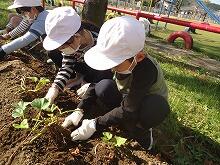 6年生のみんなは、青いサルビア、赤いサルビア、ジニア(ヒャクニチソウ)、ニチニチソウ、マリーゴールドの5種類を丁寧に植え付けました。技術員の甲斐先生が学級園の土を耕し、作業がしやすいようにと敷板を準備してくださったおかげで、短時間で終わらせることができました。