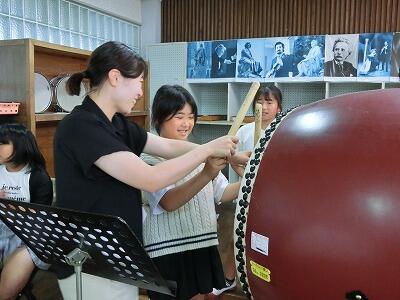 写真はリズムクラブの活動の一コマです。今、運動会で「延岡ばんば」の太鼓を発表できるように、譜面を見ながら、また、たたき方を声に出しながら猛練習中です。音楽室からあのばんば踊りの曲が流れてくるととても楽しい気持ちになって、いてもたってもいられなくなるのは不思議ですね。子どもたちもリズムに合わせて、楽しそうに叩いていましたが、難しいところもたくさんあって、苦戦する場面もありました。まだまだ完成には練習が必要ですが、運動会本番ではバッチリ仕上がってかっこいい姿を披露できると思います。どうぞお楽しみに!