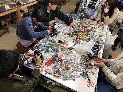 3年生が図工『クリスタルファンタジー』の作品づくりをしていました。ペットボトルと電池で光る電飾キットをもとにどんな作品にするか、また一人一人が準備してきた装飾の品々を『どんげする?』といった感じで考えながら活動していました。