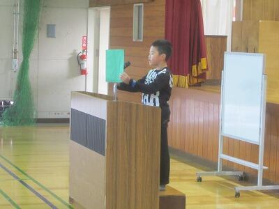 『作文発表は6年生。中学校生活を見据え、計画的な時間の使い方、算数の問題への取り組み方、今の仲間との絆づくりの3つを目標に頑張ると発表してくれました。』