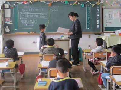 『5年生は算数。き、緊張するー。後ろから見られとるがね。』