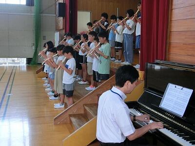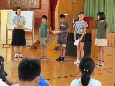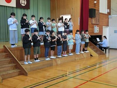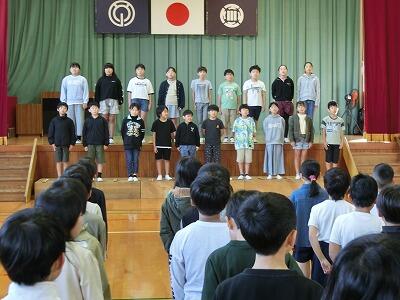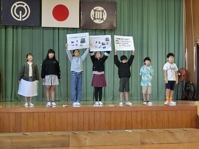 全校で「もみじ」を合唱した後、いよいよ4年生の発表です。4年生のみんなはこれまでに学習したことを生かして発表しました。最初は国語で学習した詩「ぼくは川」の音読です。詩に込められた力強さや成長を、元気な声で音読することで伝えることができました。次に社会で学習した災害に関するクイズを出題し、全校のみんなに津波や地震、台風や火山についてたくさん教えてくれました。最後のリコーダー演奏では「もののけ姫」を披露しました。二つのパートの音色が美しく響き合い、聴いているともののけ姫のシーンが浮かび上がってくるようでした。4年生のみんなの顔がアシタカやサンのように凜々しかったです。
