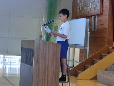 終業式で作文を発表したのでは、2年生の加藤 寿丸(じゅまる)さんでした。寿丸さんは、2学期にできるようになったこととして、「跳び箱5段」「あやとび12回」「字をていねいに書くこと」「早おき」の4つをあげていました。できるようになりたいという気持ちを大切にしてがんばってきたということでした。