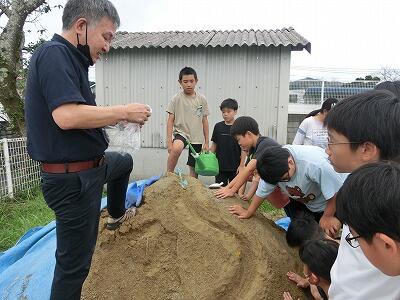 「あっ、ここけずれている!」「ここに砂がたまるんだ!」砂山に水を流すと道の形がみるみる変わっていき、子ども達はその変化についてたくさん気付いたようでした。正に「百聞は一見に如かず」です。体験活動が大好きな5年生、これからどんな実験や観察が待っているでしょうか? ワクワクですね。