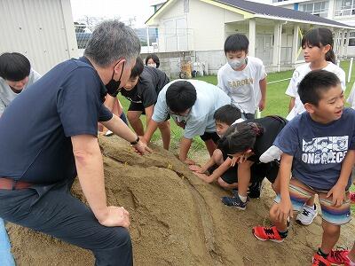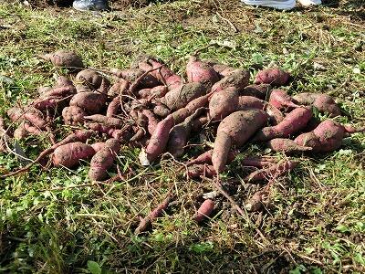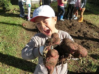 「うわっ、でっかい!」「きゃ~っ、ミミズが出てきた~」喜びやおどろきの声を上げながら掘っていく子ども達の軍手は、あっという間に泥だらけになっていき、畑の側に掘り出されたお芋が積まれていきました。これまで観察する際は土の上の様子だけだったので、土の中から大きく育ったお芋が出てくるのがとても楽しいようでした。あらかた掘り終わった後も、もっとないか最後まで探すのをがんばった2年生です。とれたお芋は後日、焼き芋とスイートポテトにして食べる予定です。みんなで頑張って掘ったお芋の味はきっと最高でしょうね。