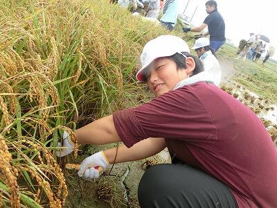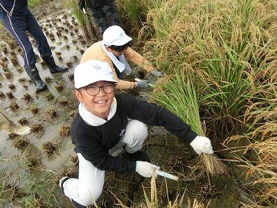雨でぬかるんだ田んぼに入って稲を刈った児童からは、「晴れた日におじいちゃんの手伝いで稲を刈ったことはあるけど、今日は雨だったので、足がはまって難しかったです。」「鎌で刈るのは難しそうだとおもったけど、意外と切れ味がよくてうまく刈れました。」などの感想が聞かれました。