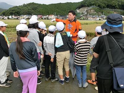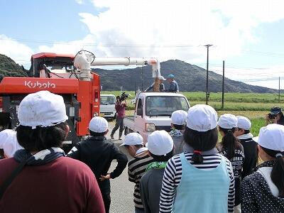 後半はコンバインが稲を刈る様子を見学しました。刈り終わるとコンバインからでてくる籾の量に子ども達は驚きの声を上げていました。機械ではあっという間に作業できるけど、手で刈るのはすごく大変なことを実感したようです。これからも生産者の方への感謝の気持ちをもって、食べ物を大切にしていってほしいです。