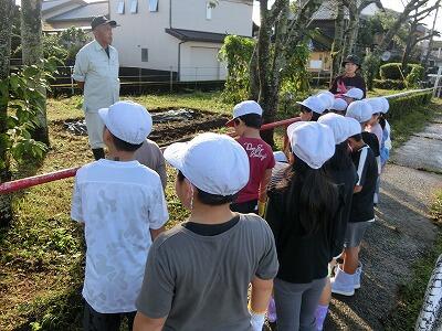 1時間目、技術員の先生が葉とつるを切って下さり、マルチのみになった畑にはりきって集合しました。先生から堀り方の説明を聞いている間も、みんなは早く掘りたくてうずうずしているようでした。
