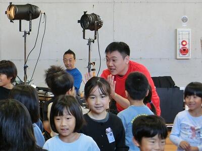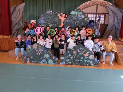 演目は絵本でも有名な「泣いた赤おに」でした。劇が始まると、一気に物語の世界に引き込まれ、役者さんの動きに驚いたり、笑ったり、そして、ちょっぴり悲しくなったりしました。赤おにと青おにの友情が心に染みたかな?たくさんの感動を味わえた川島小と港小のみんなです。