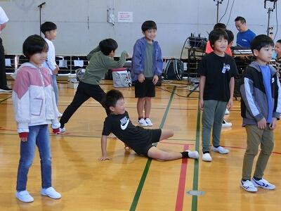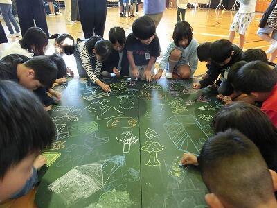 1時間目は、事前にお知らせのあった動画を見て、劇中の踊りをそれぞれの教室で練習しました。みんな、楽しく練習しすぐにマスターしてしまいました。続いて全校で集まった体育館では、みんなが仲良くなるレクリエーションゲームをしたり、劇で使用するパネルに絵を描いたりして、本番に備えました。