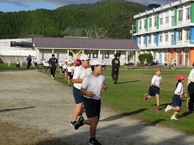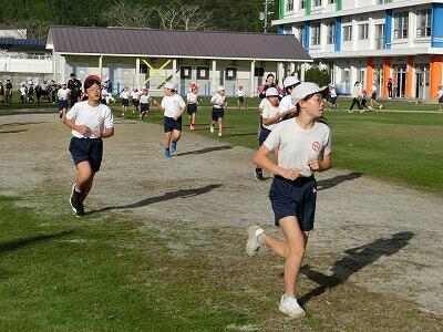 最初は、ややスローペースな走り出しでしたが、2分、3分と時間が進むにつれて、みんなの走るスピードも増してきました。顔も紅潮してきて、息も少し荒くなっていきます。「先生、7週走れました!」4年生の子が教えてくれました。しっかり最後まで走りきった満足感でにっこりの笑顔でした。