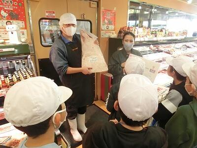 青果コーナー、鮮魚コーナー、精肉コーナーなどを回り、それぞれの所で、ポップの工夫やパックの仕方などたくさんの説明をしていただきました。お客様に喜んでもらうため、新鮮なものを届けるため、たくさん買ってもらうため、スーパーマーケットにはたくさんの工夫があることを知りました。バックヤードにも入れてもらった子ども達は、秘密をたくさん知って大満足です。「ゴールデンゾーン」、「よびこみ君」など新しく知った言葉もたくさんありました。