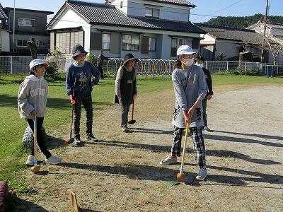 「最初は力加減が分からなかったけど、優しく教えてもらったので、だんだん上手く打てるようになって、楽しかったです。」ある男の子の感想です。それぞれのグループでは、手振り身振りでコーチしてもらいながら、声援や楽しそうな笑い声が最後まで響いていました。グラウンドゴルフの楽しさに気づき、いつしか夢中になっていた5年生、なんと、ホールインワンを達成した子が2名もいました。みんな気持ちはすっかりプロゴルファーだったかな?