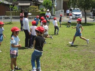 『次はみんなで手遊び歌です。おーちた、おちた、なーにがおちた?リンゴ?ゲンコツ?カミナリ?』