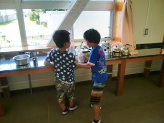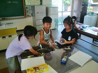 家庭科室から何やら賑やかな声が聞こえてきたのでのぞいてみると、2年生が色々な容器を使って『かさしらべ』をしていました。リットルマスを使いながら、やかん、おわん、ペットボトル等々・・・・に入る水の量を班ごとに調べていました。『あーじゃない、こーじゃない』と言いながら、それでも協力しながら真剣に学習に取り組んでいました。