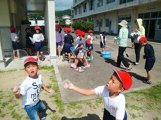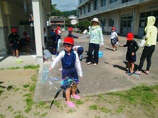 1年生が生活科の学習でシャボン玉を作っていました。うちわやペットボトルを改良したものなど、いろんな道具を使って楽しそうに活動していました。ギラギラ太陽の光がシャボン玉にあたり、キラキラ輝いてとてもきれいでした。