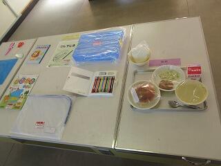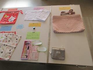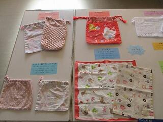 歯ブラシコップ入れ、ナフキン入れ、本バック、ジューズ入れ、体育の服入れ等、一言アドバイスが書かれており、非常に分かり易くなっていました。どれも1年担任の先生の娘さんのもので、手づくりの物もあり、またまた感動・・・。笑う