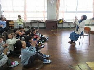 低学年の時間では、『かえるをのんだわとさん』『ババヤガーと白い鳥』『くだものなあに』『コカのカメ』などたくさん素敵な絵本を読んでいただきました。子どもたちの大好きな『あいうえおにぎり』では大盛り上がり!!