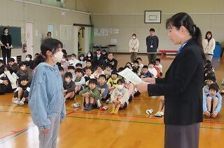 最初に、「社会を明るくする作文」で保護司会会長賞を受賞した6年生の児童に表彰状を渡しました。お祝い
