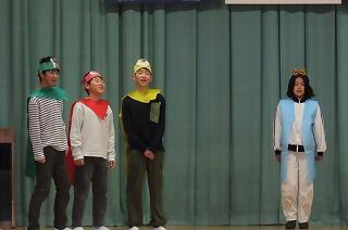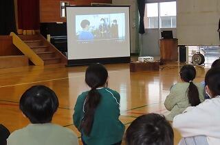 集会が1週間延期になったので、調理員さんの動画を見てから委員会の子どもたちの劇です。