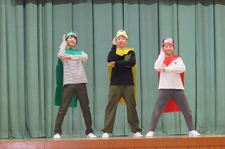 いよいよ『給食戦隊たべるんじゃー!!』の登場です。イエロー、グリーン、レッドで、栄養素を分かり易く演じてくれた上にバランスが大事と給食室の妖精が登場するあたり、さすがだな・・・と感心したところです。ほくそ笑む・ニヤリ