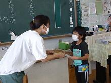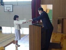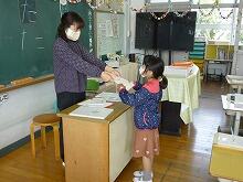 1年生の教室では、担任の先生が、通知表の見方を説明した後、子供達一人一人ががんばってきたことをみんなに紹介しながら通知表を渡していました